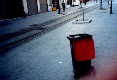 Tram lines down the middle of the street